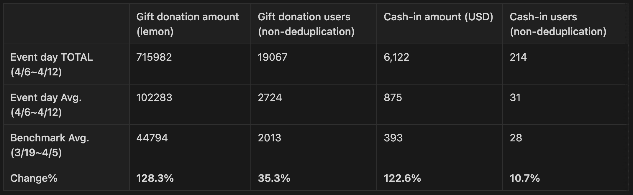 For the cash-in amount, we got $6,122 USD cash-in in total (avg. $875 per day). Compared to the benchmark from 3/19~4/5, the avg. cash-in amount enhanced by 122% (393 → 875).